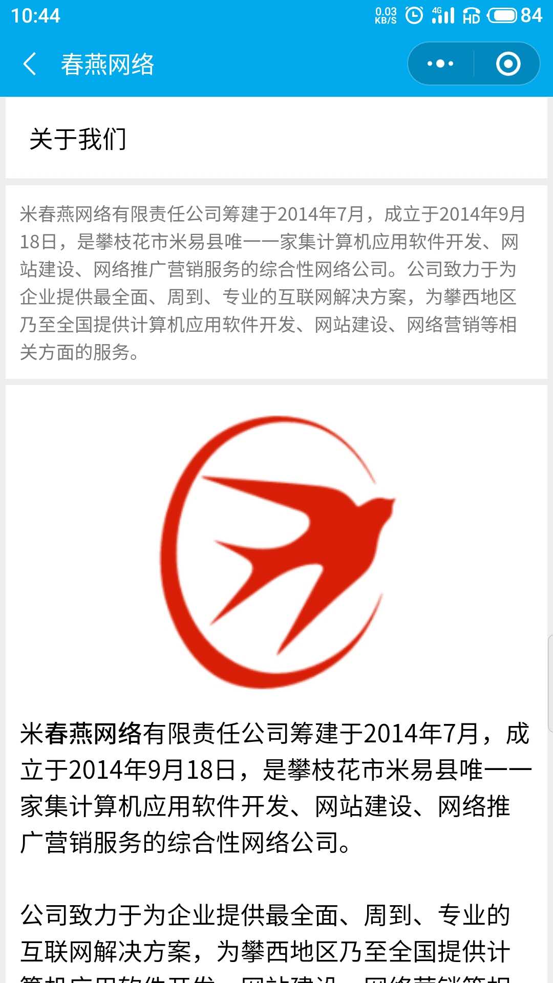 米易縣春燕網(wǎng)絡(luò)官方微信小程序開發(fā),基于微信小程序開發(fā),實現(xiàn)了春燕網(wǎng)絡(luò)官網(wǎng)無縫對接,展示官方資訊信息,同時還與春燕網(wǎng)絡(luò)微信公眾號無縫對接,小程序二維碼及相關(guān)頁面展示如下圖: